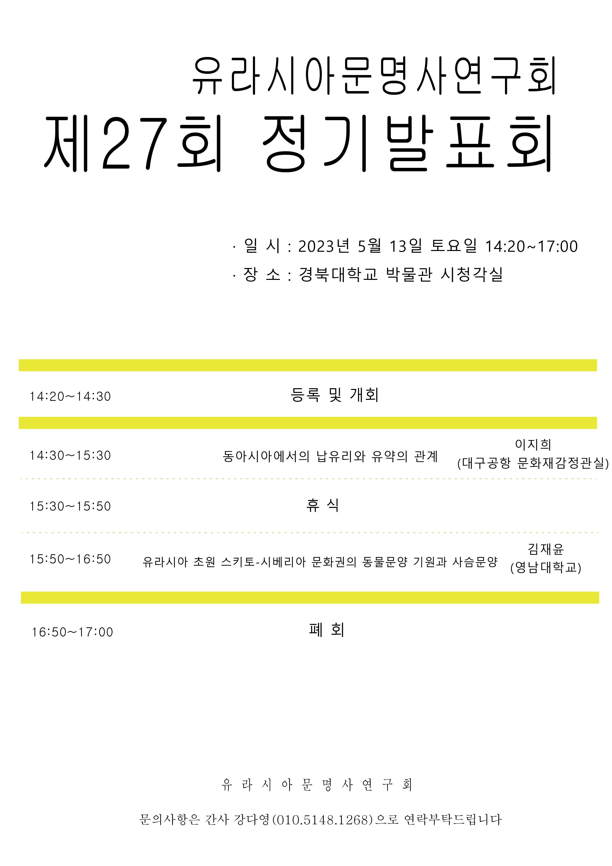 2023년 5월 13일 토요일, 유라시아문명사연구회 제27회 정기발표회가 진행될 예정입니다.