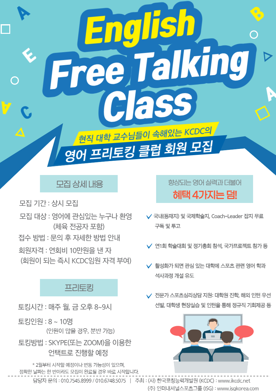 본 KCDC에서는 영어능력을 기르고자 ‘주제가 있는 free talking’이라는 클럽을 만들려고 합니다.