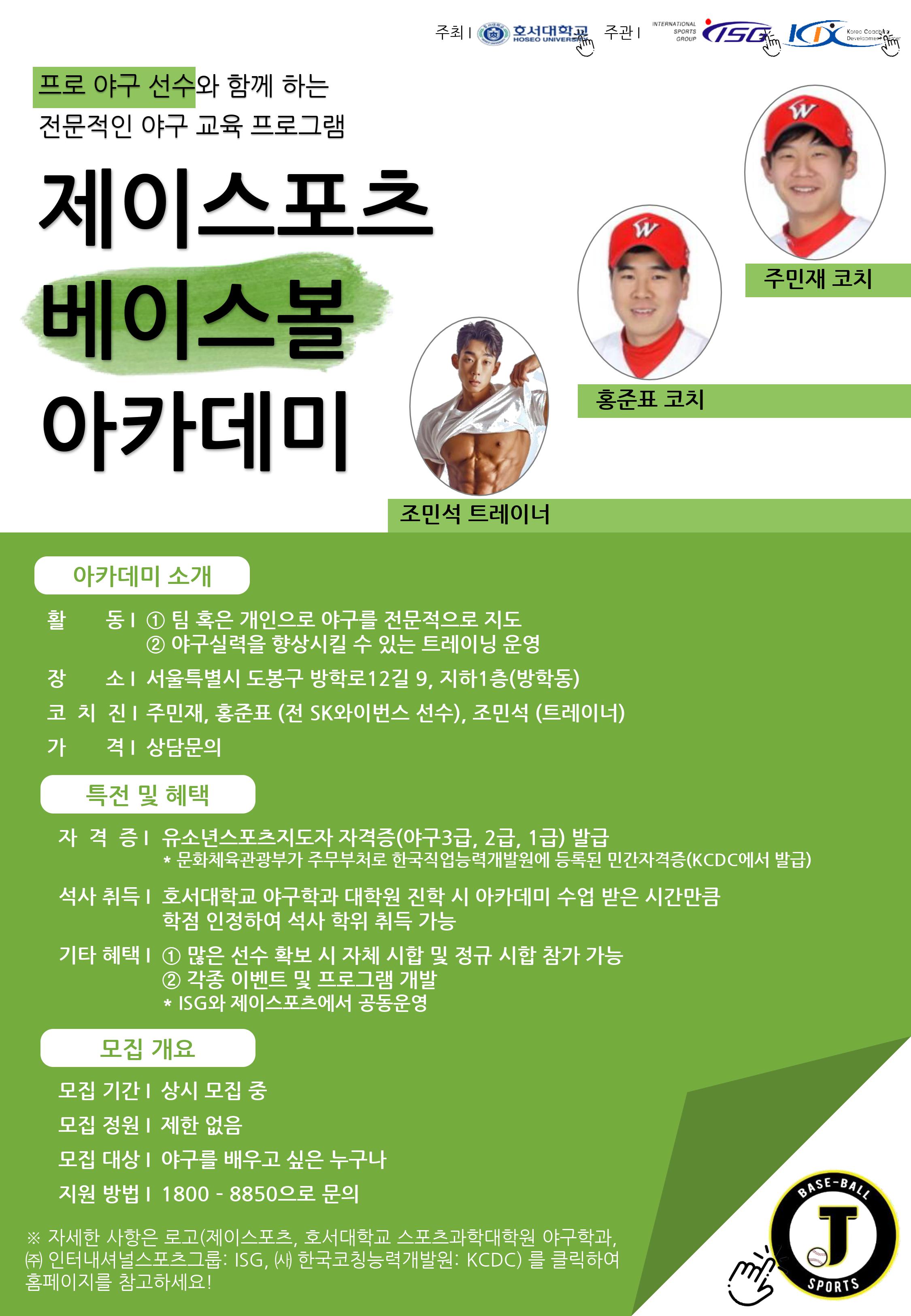제이스포츠 베이스볼 아카데미는 ISG+KCDC+호서대 스포츠과학대학원 야구학과와 함께하는 프로젝트 입니다. 많은 가입 부탁드립니다. 더 자세한 정보를 원하신다면 공지사항에