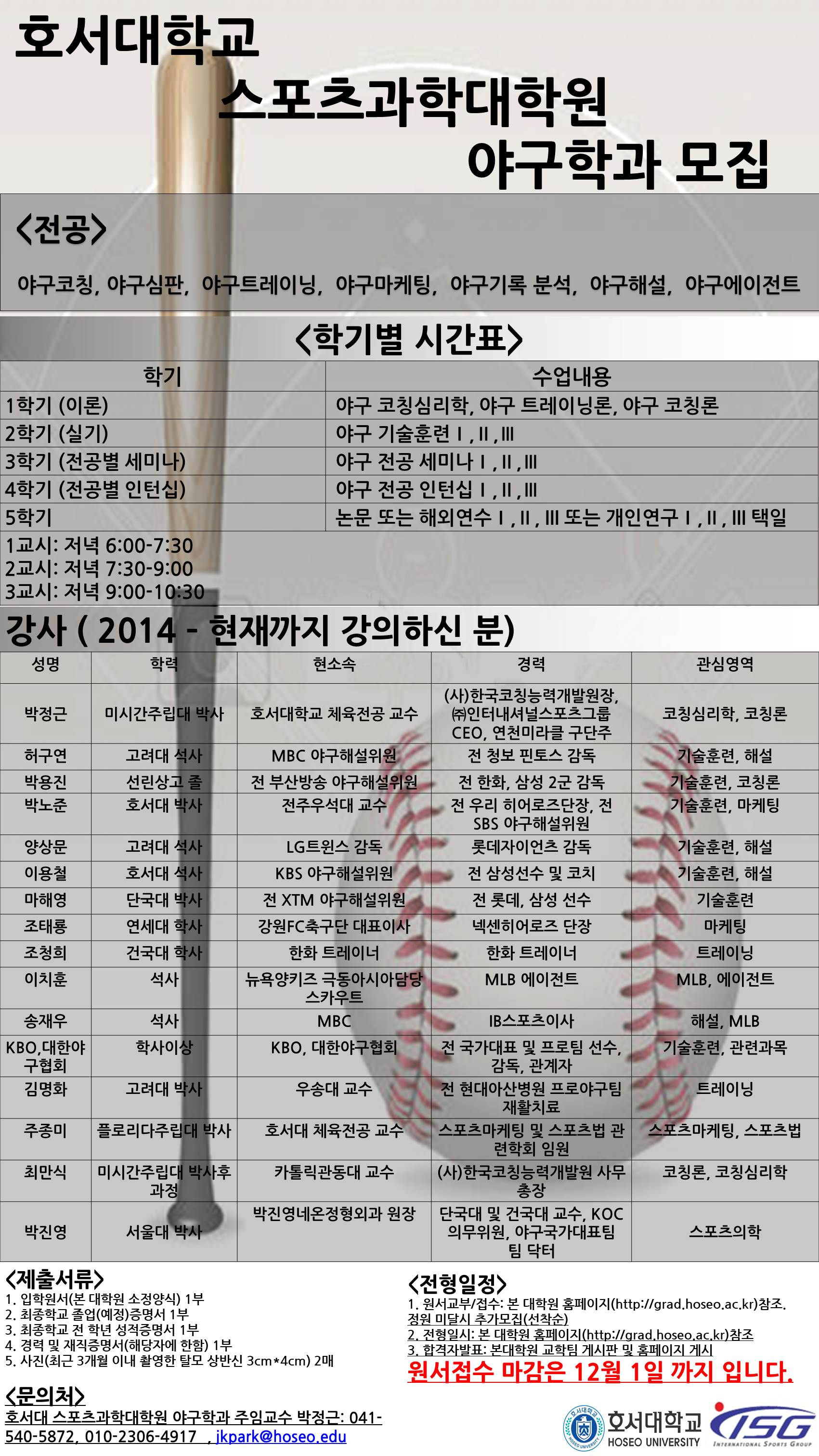 호서대학교 스포츠과학대학원 야구학과에서 대학원생을 모집합니다. 첨부파일을 참조하시고 문의사항은 010-2306-4917로 직접 문의하시기 바랍니다. 접수마감일은 12월1일 입니다.
