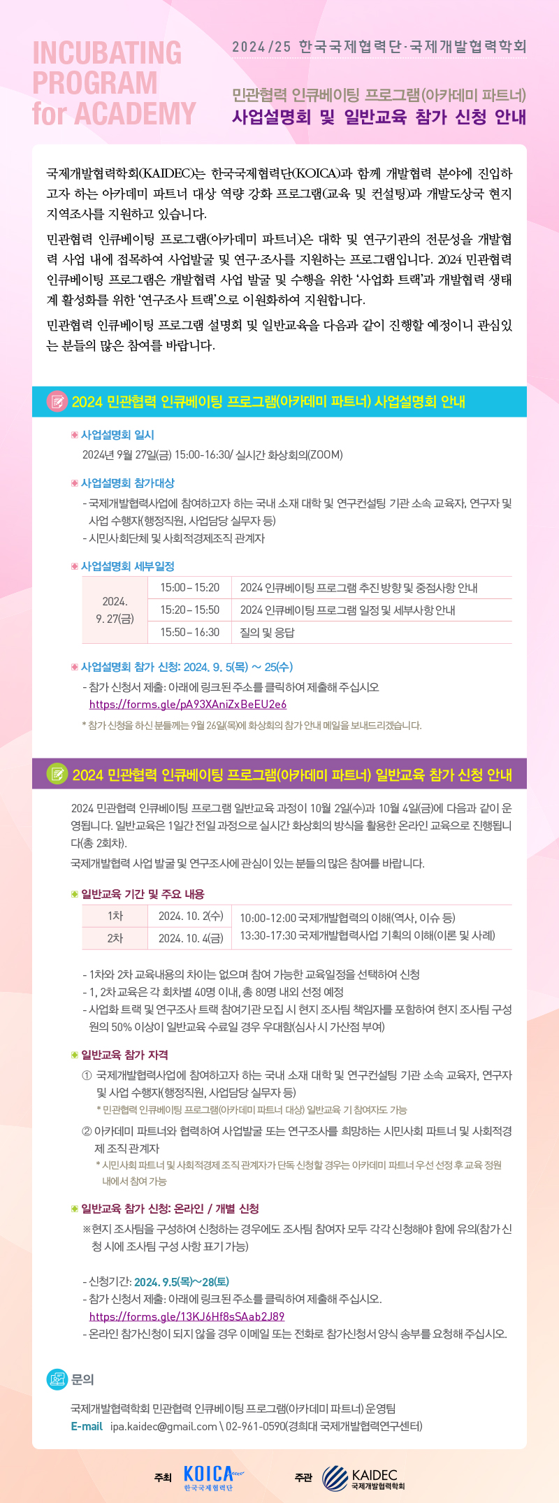 귀 학회의 회원들이 개발협력 사업 수행 및 현장 기반 연구·조사에 참여할 수 있도록 민관협력 인큐베이팅 프로그램(아카데미 파트너사업설명회 참가 관련 홍보를 요청드립니다.