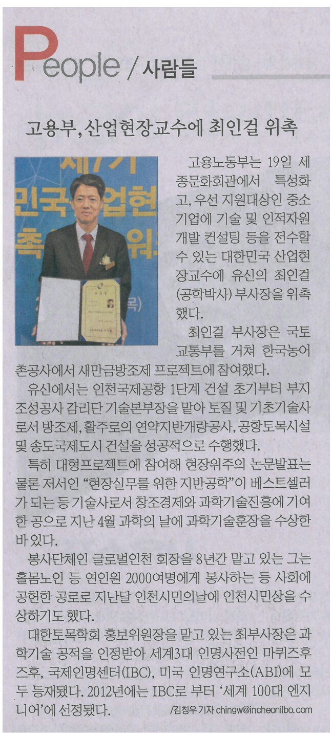우리학회 회원이신 (주)유신 최인걸 부사장이 고용노동부 산업현장교수로 위촉되었음을 알려드립니다.