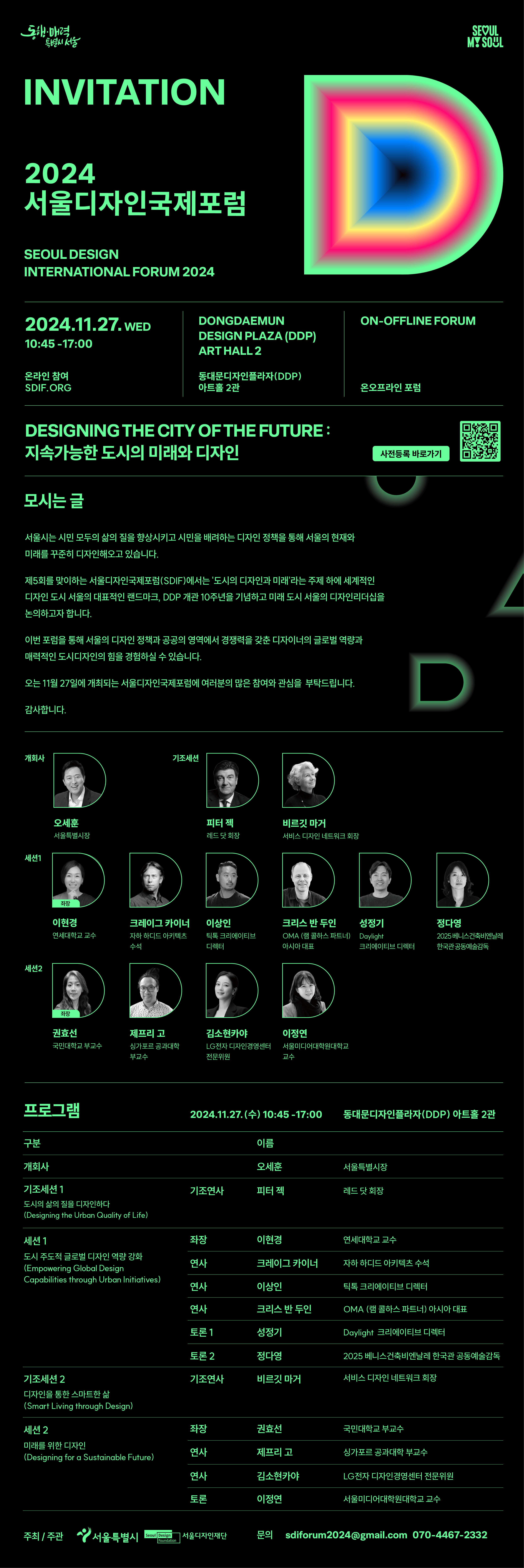 이번 포럼을 통해 서울의 디자인 정책과 공공의 영역에서 경쟁력을 갖춘 디자이너의 글로벌 역량과 매력적인 도시 디자인의 힘을 경험하실 수 있습니다.