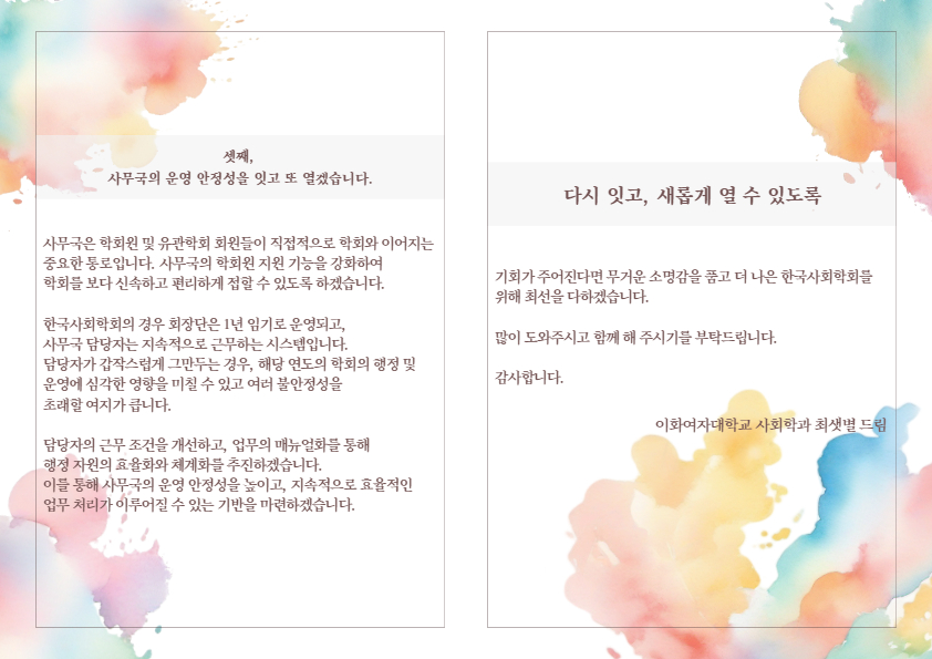 우리 학회 회원이자 학회장이신 최샛별 교수님이 차차기 한국사회학회장 선거에 출마하셨음을 알려드립니다.
