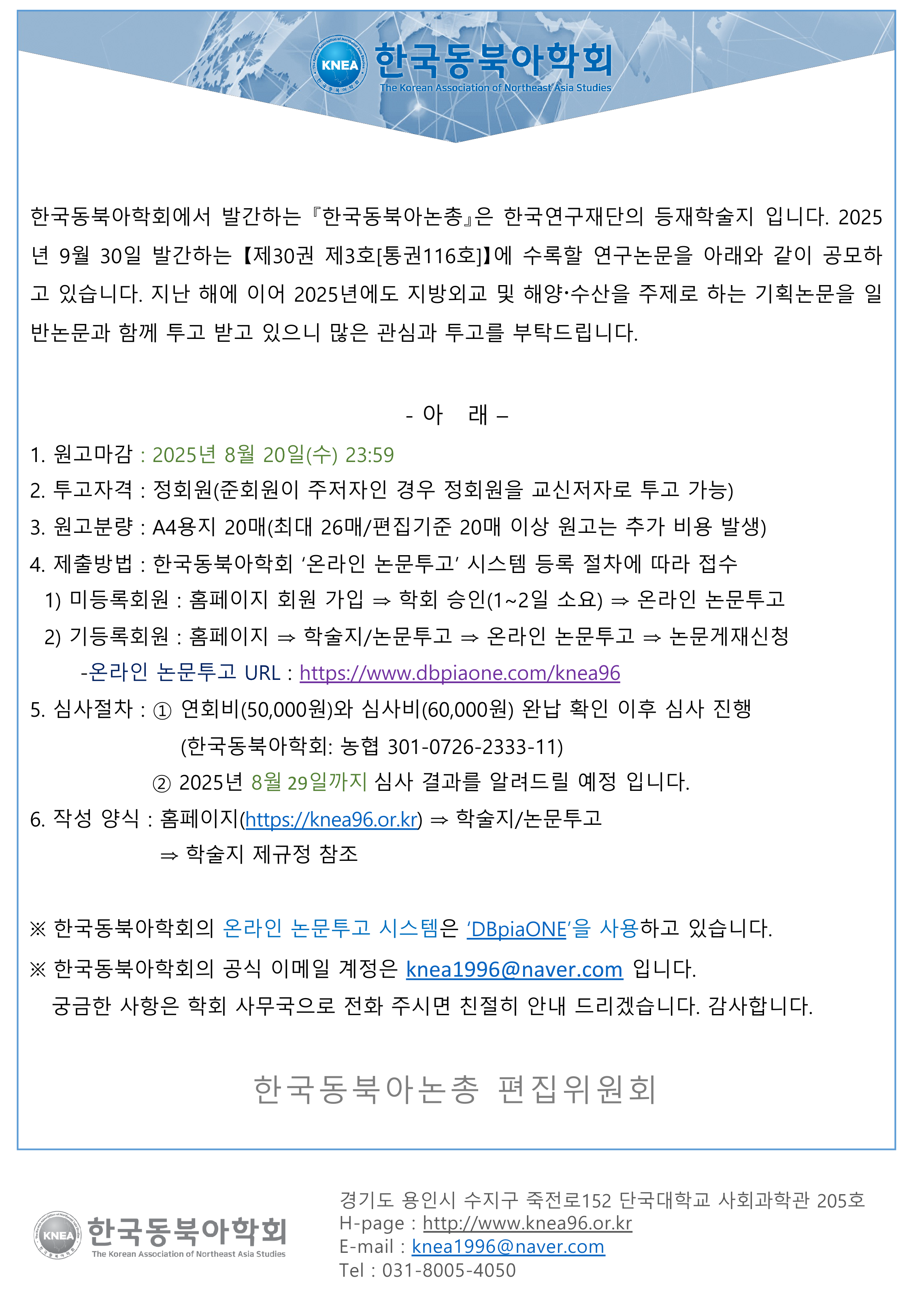 5. 심사절차 : ① 연회비(50,000원)와 심사비(60,000원) 완납 확인 이후 심사 진행 (한국동북아학회: 농협 301-0726-2333-11) ② 2025년 8월 29일까지 심사 결과를 알려드릴 예정 입니다.