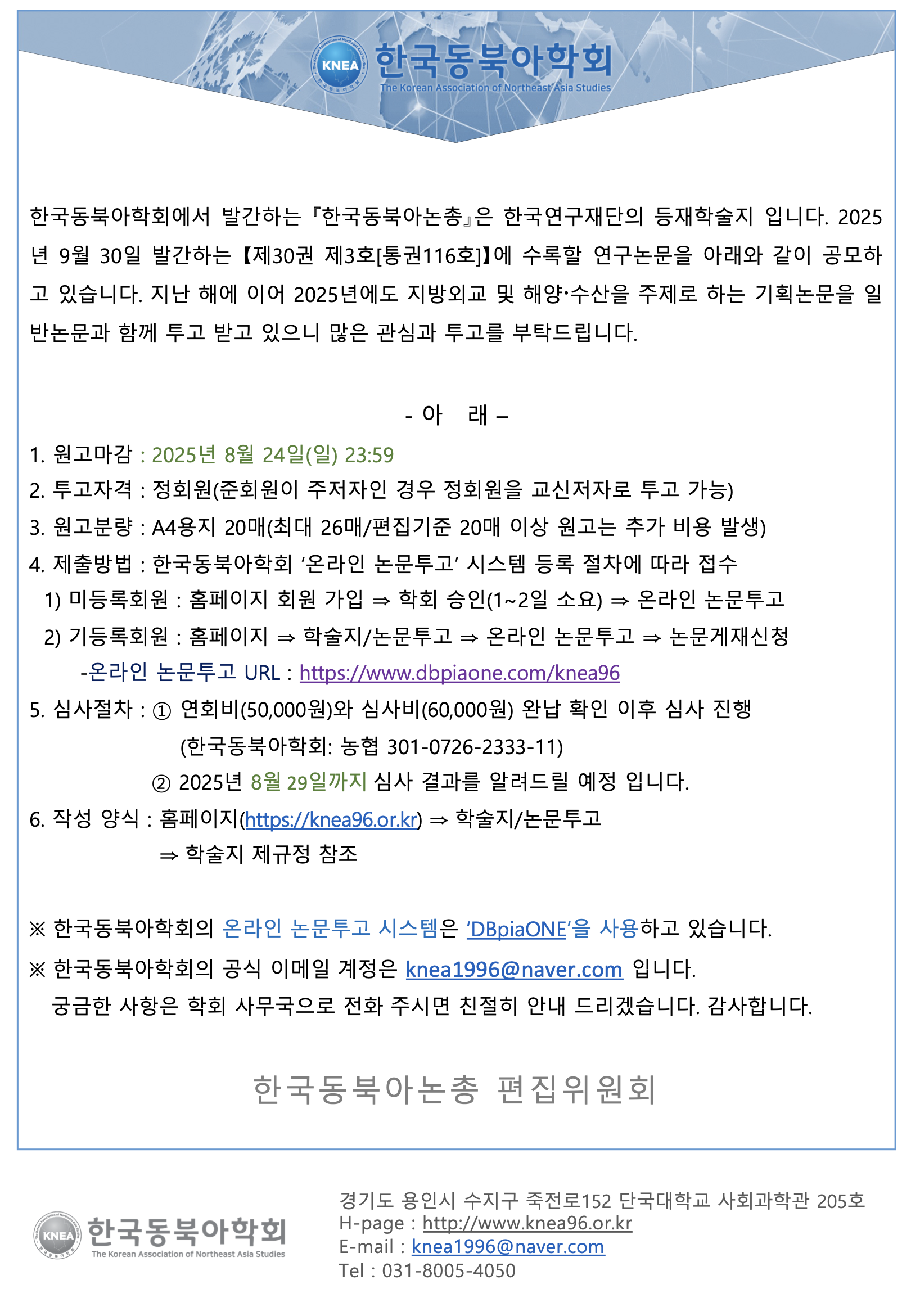 ※ 한국동북아학회의 공식 이메일 계정은 knea96@knea96.or.kr 입니다.