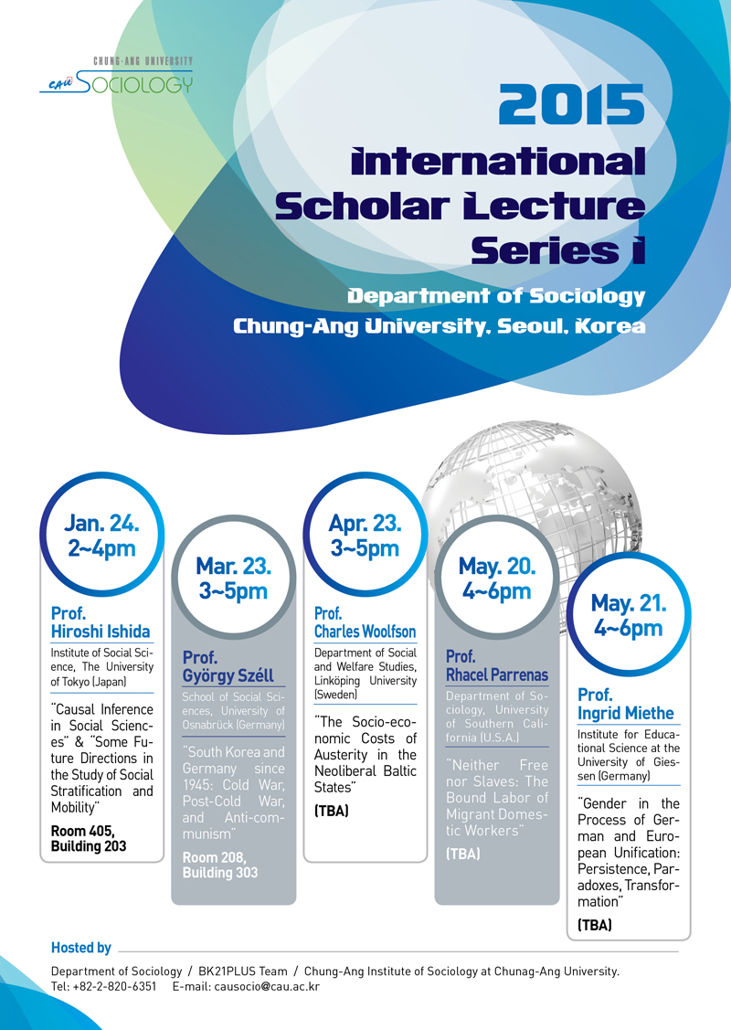중앙대 사회학과 BK21플러스 “복합위기 시대의 지속가능한 사회통합” 사업팀은 작년에 이어 올해도 해외 저명학자 초청강연 시리즈를 개최한다. 독일 Osnabrück 대학의 György Széll 교수와 스웨덴 Linköping 대학의 Charles Woolfson 교수의 강연에 이어, 오는 5월 20일(수)과 21일(목) 각각 미국 University of Southern California 대학 사회학과 교수이자 학과장인 라셀 파레냐스(Rhacel Parreñas) 교수와 독일 University of Giessen 대학의 잉그리드 미테(Ingrid Miethe) 교수의 강연이 있을 예정이다. 자세한 내용은 다음과 같다.