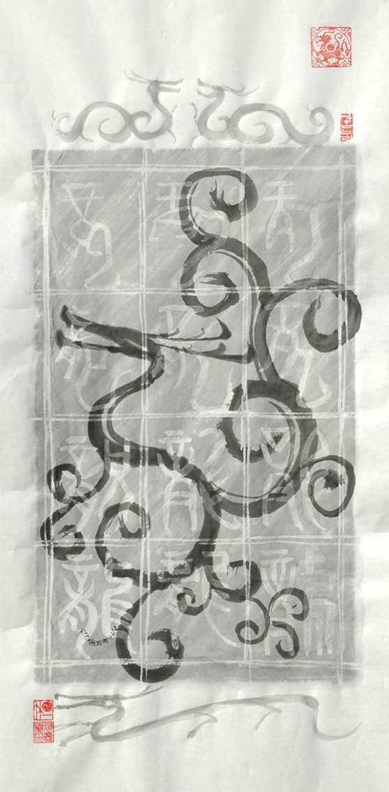 (1) 새해 그림: 바탕의 흰색으로 보이는 글자들은 갑골문(胛骨文), 금문(金文: 주로 상나라 주나라 시대의 청동기 등 금속기에 새겨진 글씨) 등에 보이는 고대 용(龍)자를 12가지 선택하여 쓴 것입니다. 글자 위아래의 선화(線畵)도 용입니다. 잘 그린 그림은 아니지만 함께 즐기시기 바랍니다.