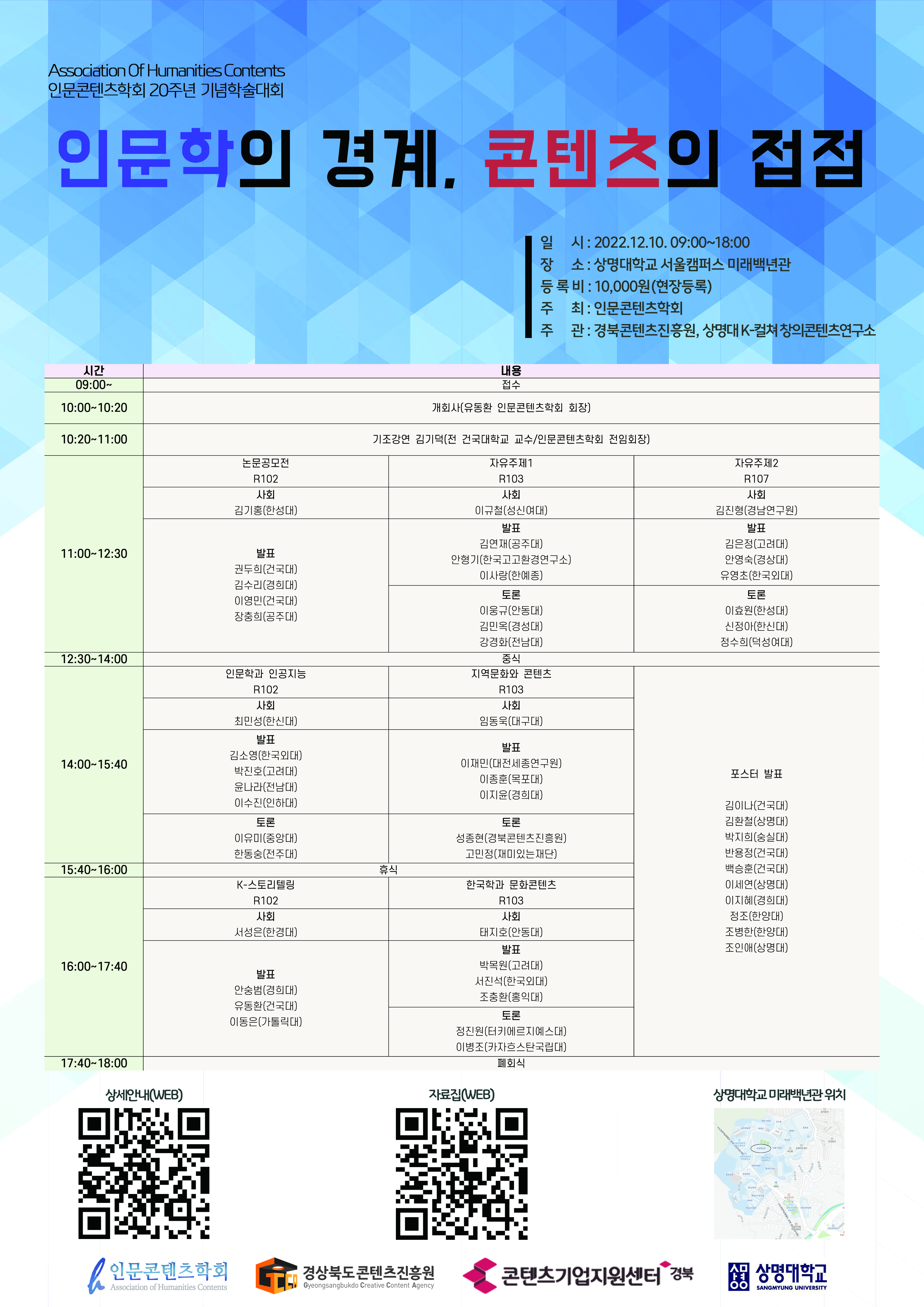 20주년을 기념하여 인문콘텐츠학을 둘러싼 여러 문제를 중심으로 20주년 기념사업 준비위원회(위원장 김상헌 교수, 상명대학교)에서 열심히 준비하였습니다.