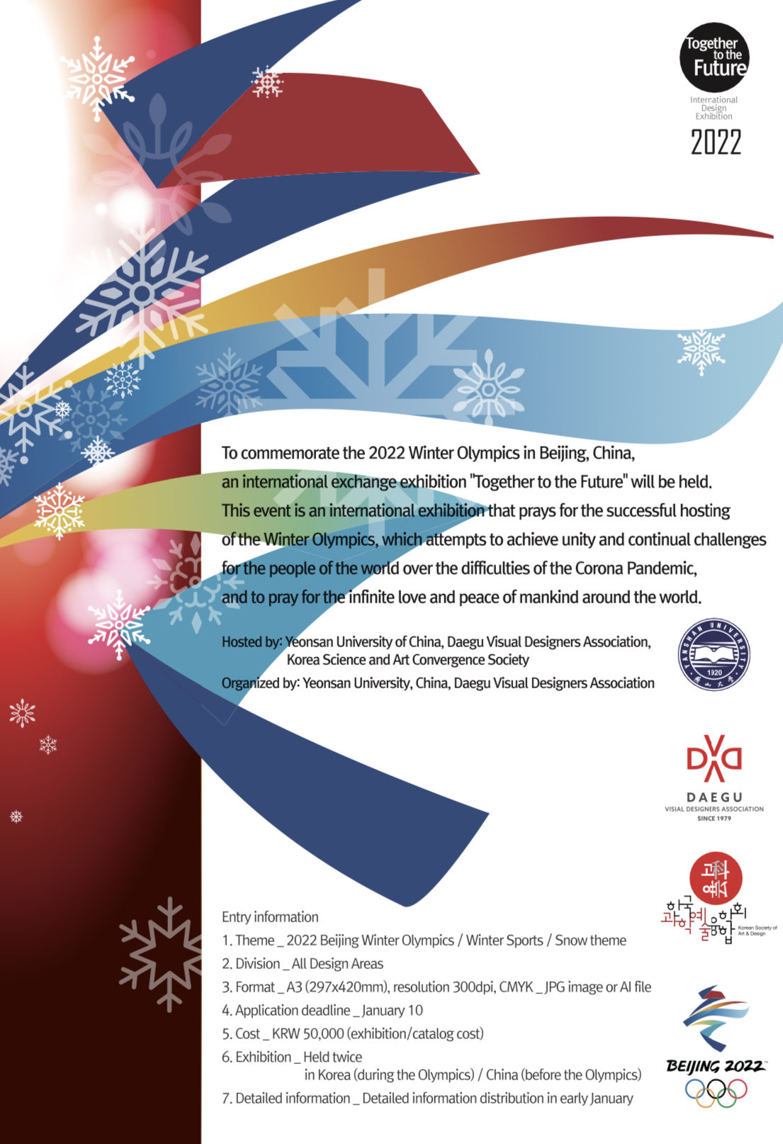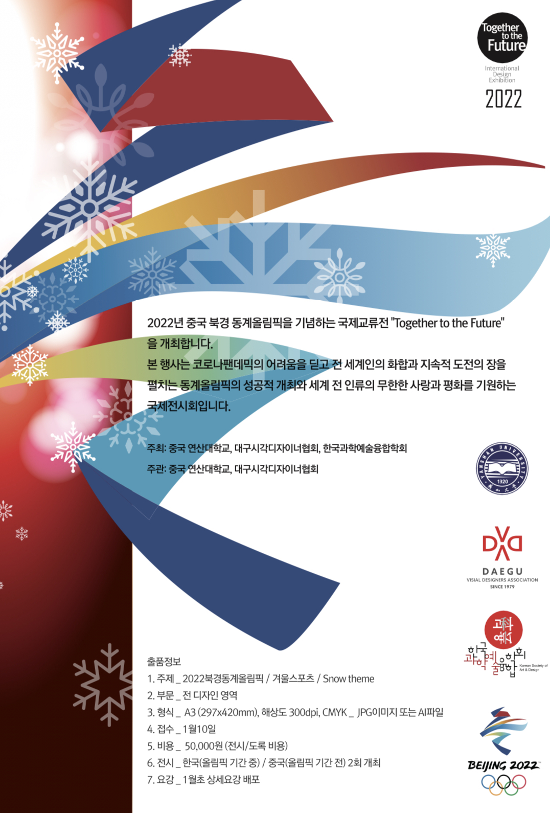 안녕하세요. 본 학회와 MOU를 맺은 대구시각디자인너협의회에서 개최하는 2022년 중국 북경 동계올림픽 기념 국제전 공지입니다. 참가를 원하시는 분은 아래사항 참고하셔서 접수준비해주시면 됩니다. 주제: 2022 북경동계올림픽 / 겨울 스포츠 / Snow theme 부문: 디자인 전 영역 형식: A3(297x420mm), 해상도 300dpi, CMYK_ JPG 이미지 또는 AI파일 접수일정: 1월 10일 전시기간: 한국(올림픽 기간 중),중국(올림픽 기간 전) 요강: 1월 초 상세요강 배포 세부 공지는 빠른 시일 내 재공지 하겠습니다. 많은 참여 부탁드립니다.