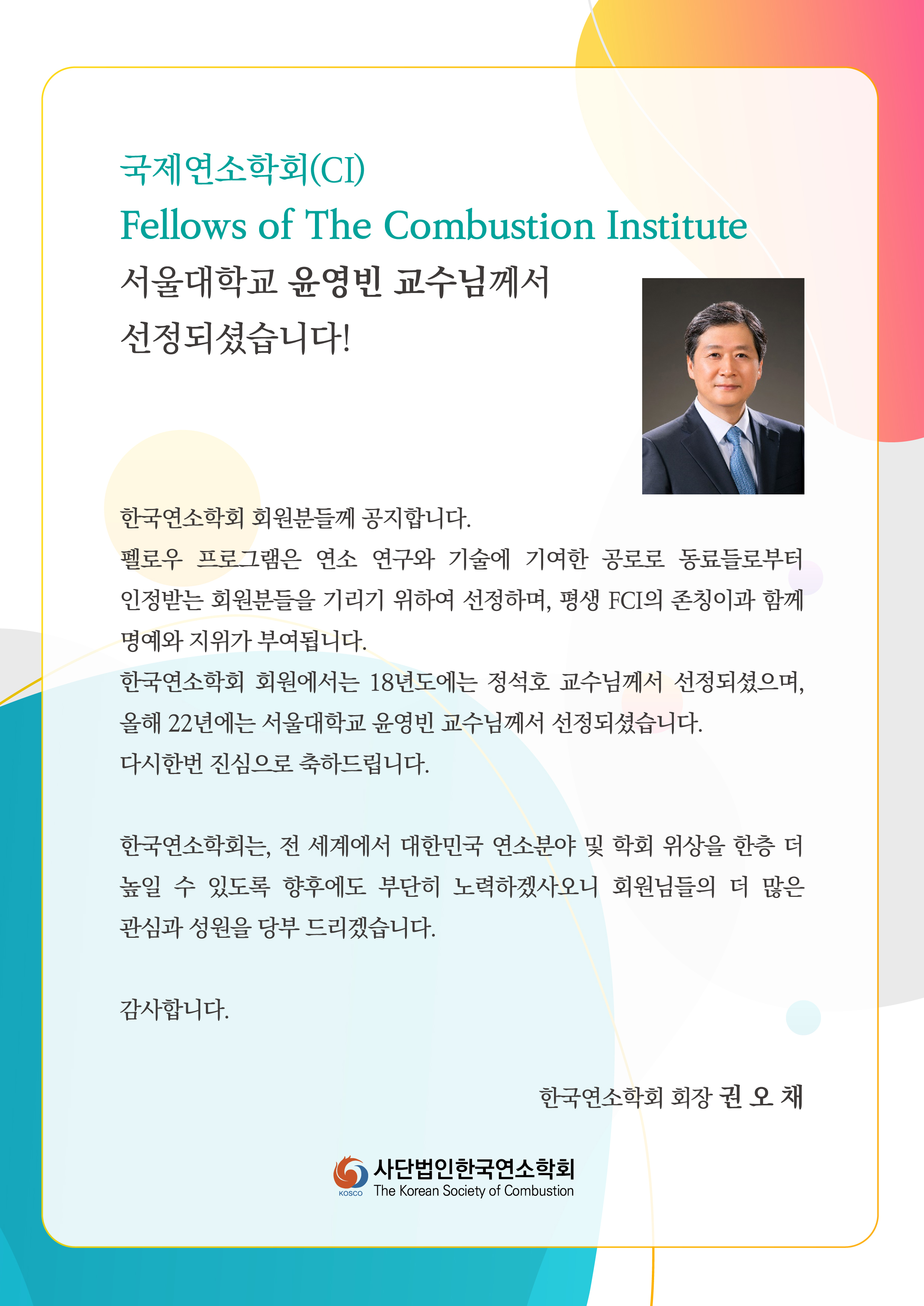 국제연소학회 Fellows of The Combustion Institute 서울대 윤영빈 교수님 선정!