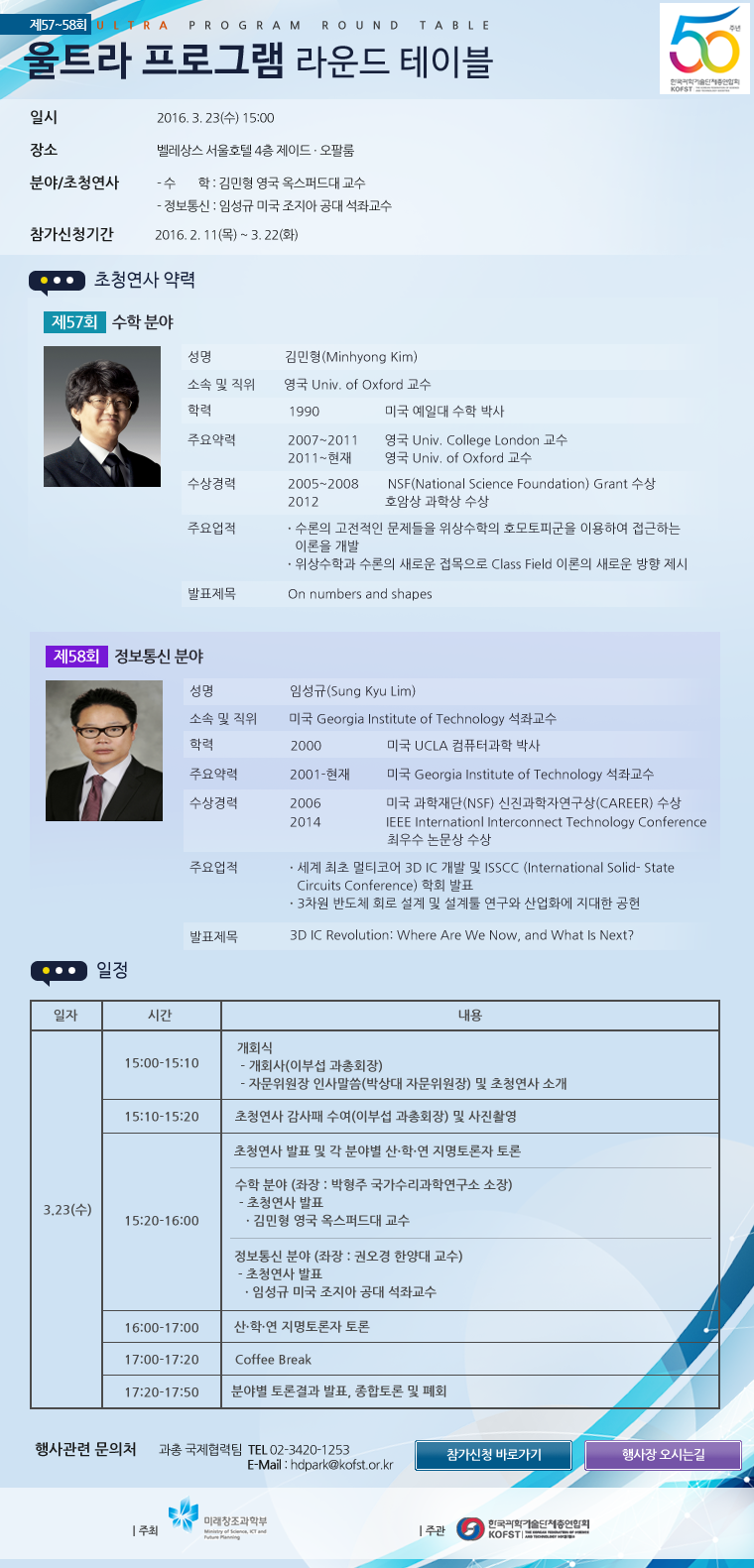 이번 울트라 프로그램은 서울 벨레상스 서울호텔에서 수학 분야와 정보통신 분야를 개최할 예정이며, 참석을 희망하시는 분은 과총 국제협력 통합 홈페이지(www.ultari.org)에 접속하셔서 온라인 신청을 해주시면 되겠습니다.